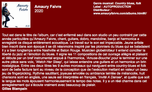 Harmoniciste, guitariste et chanteur, Amaury Faivre est un artiste de blues acoustique, avec 25 ans de carrière, plus de 1000 concerts, une dizaine de pays et 3 continents.